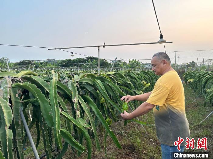 9月,台胞曾鈞毅正在查看火龍果生長情況。 鄭江洛 攝