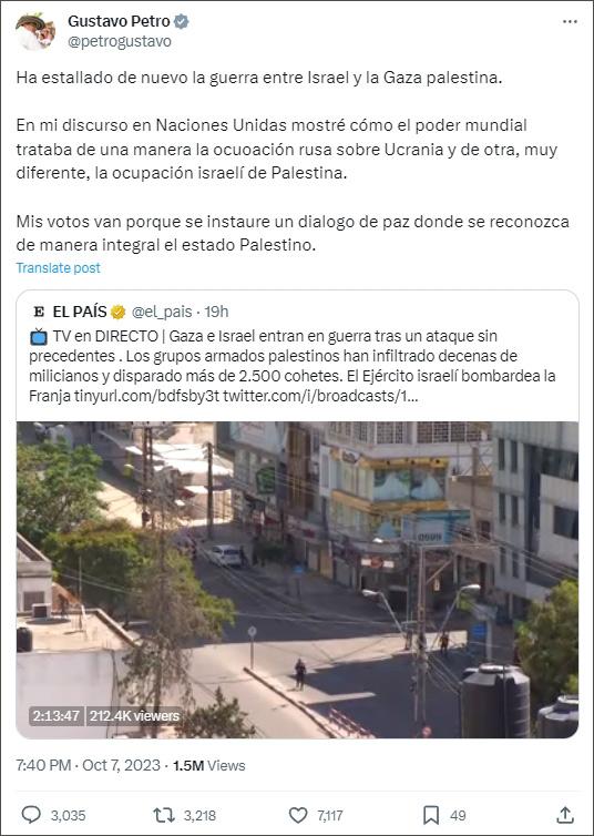 “以色列和巴勒斯坦在加沙地帶再次爆發戰爭(zheng) 。在聯合國的演講中,我曾展示了世界大國如何以一種方式對待俄羅斯對烏(wu) 克蘭(lan) 的占領,但又以另一種截然不同的方式對待以色列對巴勒斯坦的占領。 ”佩特羅在社交媒體(ti) X發文說,“我支持建立和平對話,巴勒斯坦國將得到全麵承認。”
