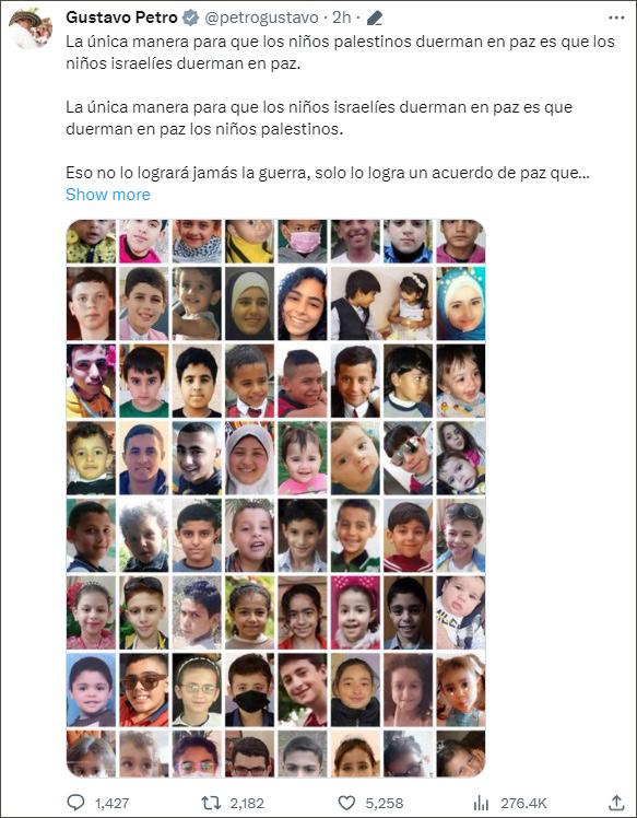 10月8日,佩特羅還發布了一張據稱是遭以色列殺害的巴勒斯坦少年兒(er) 童的照片。