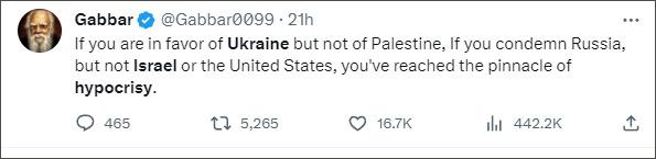 美國合眾(zhong) 國際社(UPI)報道注意到,有很多媒體(ti) 專(zhuan) 欄作者和社交媒體(ti) 用戶都指出了西方在俄烏(wu) 衝(chong) 突等問題上的“虛偽(wei) 行為(wei) ”,佩特羅並不是唯一一位。例如一名認證為(wei) “作家”的社交媒體(ti) 用戶寫(xie) 道:“如果你支持烏(wu) 克蘭(lan) 而不支持巴勒斯坦,如果你譴責俄羅斯卻不譴責以色列或美國,那麽(me) 你就已經達到了虛偽(wei) 的頂峰。”
