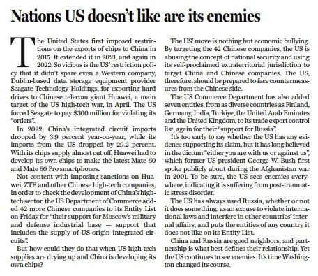如今“涉俄”成了美國最愛的借口,美方甚至可以據此公然違反國際法,幹涉他國內(nei) 政,任何實體(ti) 隻要美國“看不順眼”,皆可列入所謂的“實體(ti) 清單”。“滿眼皆是敵”的華盛頓是時候該換個(ge) 心態了!