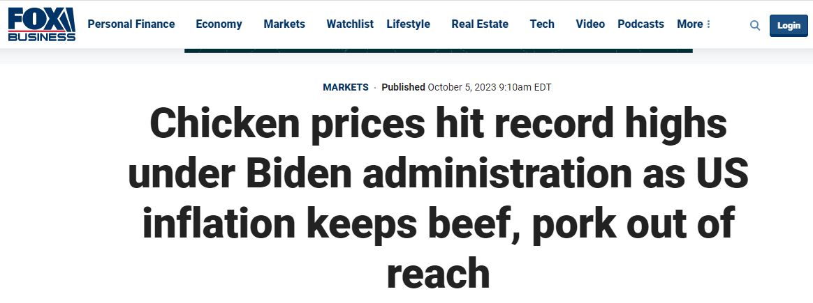 另據美國福克斯商業(ye) 頻道(Fox Business)網站報道,受到持續通貨膨脹影響,美國牛肉和豬肉價(jia) 格保持高位,普通消費者不得不轉向略微便宜一些的雞肉。然而,全美零售店的雞肉價(jia) 格也隨著需求量的增加而水漲船高,更是創下曆史新高,並且預計還將保持在高位。