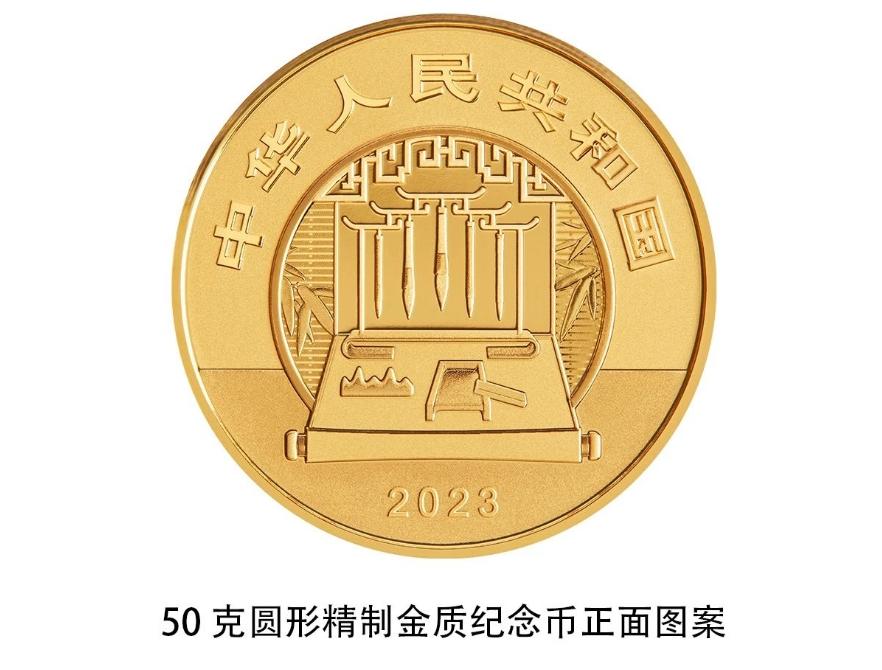 4枚圓形金銀紀念幣正麵圖案均為(wei) 筆、墨、紙、硯造型,輔以竹葉、窗等裝飾組合設計,並刊國名、年號。