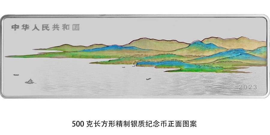 500克長方形銀質紀念幣正麵圖案為(wei) 山、水等組合設計,並刊國名、年號。
