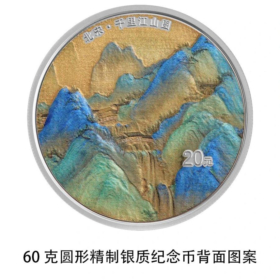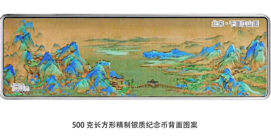 該套金銀紀念幣背麵圖案均為(wei) 《千裏江山圖》局部場景,並刊“北宋·千裏江山圖”字樣及麵額。