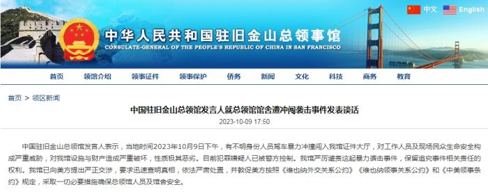 中新網10月10日電 據中國駐舊金山總領館網站消息,中國駐舊金山總領館發言人表示,當地時間2023年10月9日下午,有不明身份人員駕車暴力衝(chong) 撞闖入中國駐舊金山總領館證件大廳,對工作人員及現場民眾(zhong) 生命安全構成嚴(yan) 重威脅,對中國駐舊金山總領館設施與(yu) 財產(chan) 造成嚴(yan) 重破壞,性質極其惡劣。