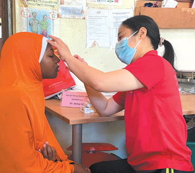 8月27日,中國(江蘇)第三十二期援桑給巴爾醫療隊眼科醫生董莉莉(右)在坦桑尼亞(ya) 桑給巴爾島為(wei) 當地患者檢查。