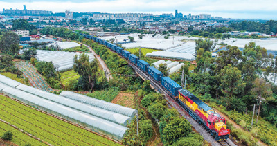 “滬滇·瀾湄線”國際貨運班列開行首發儀(yi) 式近日在雲(yun) 南省昆明市王家營西集裝箱中心站舉(ju) 行。滿載來自東(dong) 南亞(ya) 地區的水果、橡膠和白糖、金屬矽等產(chan) 品的班列,駛向上海臨(lin) 港新片區蘆潮港站。圖為(wei) “滬滇·瀾湄線”國際貨運班列駛出王家營西集裝箱中心站。