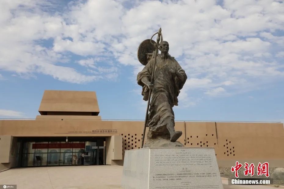 資料圖:位於(yu) 新疆維吾爾自治區的高昌故城前,現陳列有唐代高僧玄奘的塑像,玄奘西行求法時曾途經此地。