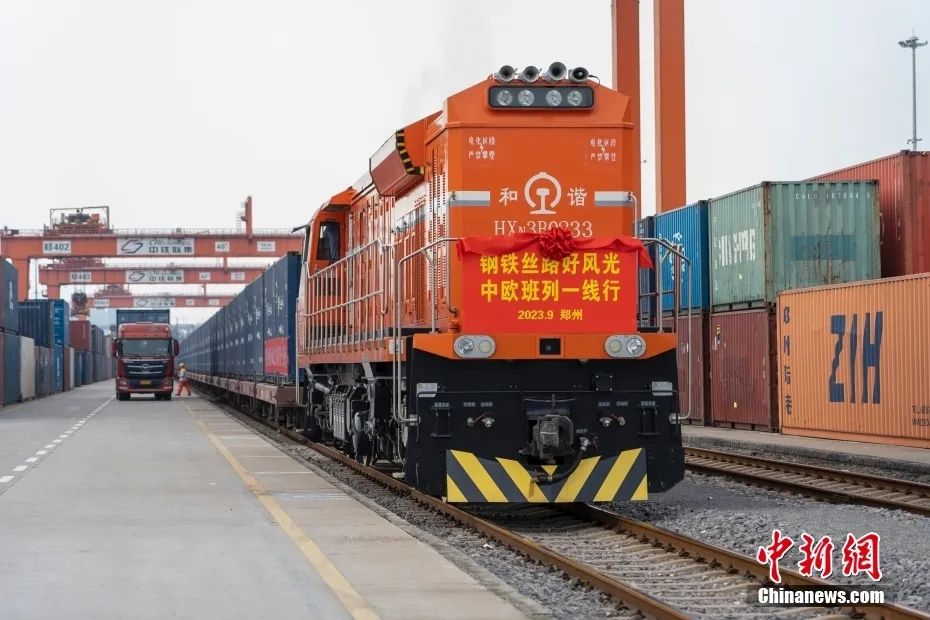 2023年9月17日,河南鄭州,一列滿載醫療器械、汽車配件等貨物的中歐班列(鄭州)從(cong) 中國鐵路鄭州局集團有限公司圃田車站駛出,將經中國二連浩特開往德國漢堡。