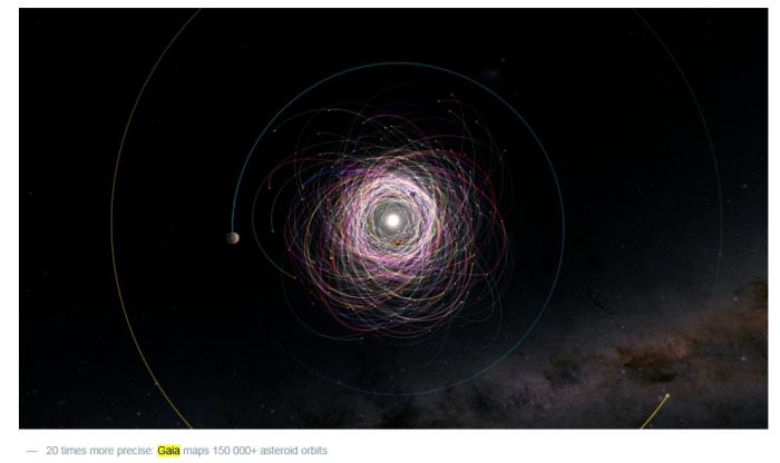 “蓋亞(ya) ”團隊繪製出的150000多顆小行星的軌道。圖片來源:歐洲航天局官網