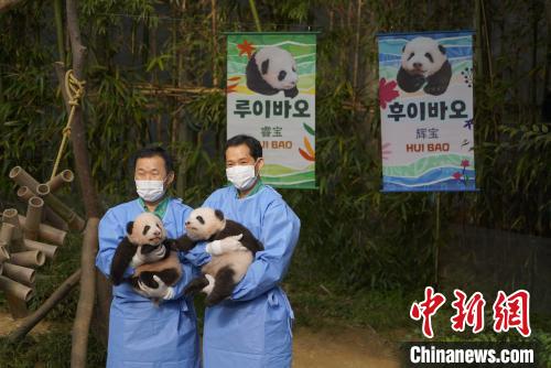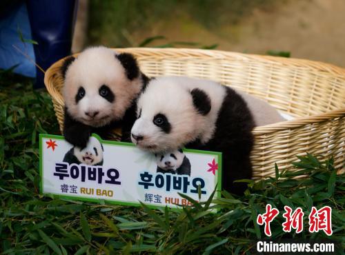 旅韓大熊貓“愛寶”“樂(le) 寶”的雙胞胎雌性幼崽即將出生滿百日。12日上午,位於(yu) 韓國京畿道龍仁市的愛寶樂(le) 園熊貓館舉(ju) 行雙胞胎幼崽首次公眾(zhong) 見麵會(hui) ,並公布了它們(men) 的名字為(wei) “睿寶”和“輝寶”。
