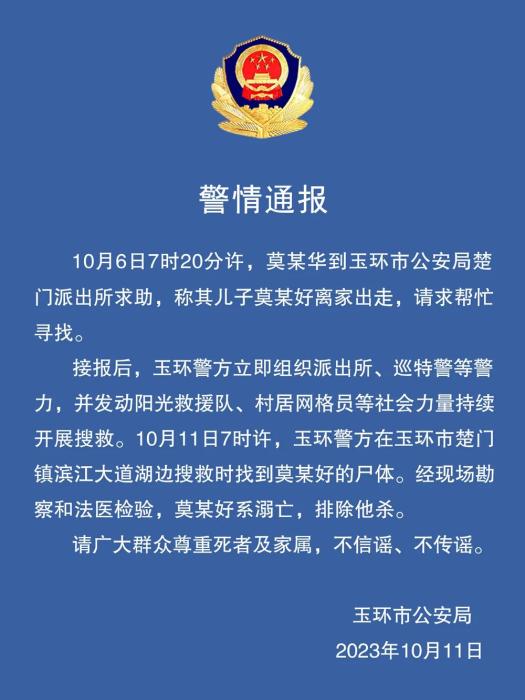 中新網10月11日電 浙江省玉環市公安局11日在其官方微信發布警情通報稱,10月6日7時20分許,莫某華到玉環市公安局楚門派出所求助,稱其兒(er) 子莫某好離家出走,請求幫忙尋找。