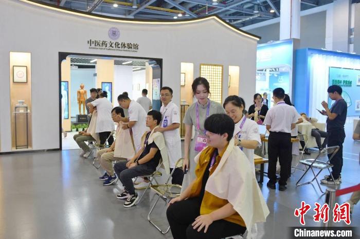 浙江省中山醫院的推拿團隊在中醫藥文化體(ti) 驗館服務中外媒體(ti) 。浙江省中山醫院供圖