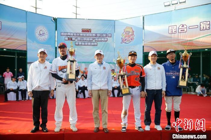 “昆山媽祖杯”海峽兩(liang) 岸慢速壘球邀請賽已成為(wei) 昆山的代表性體(ti) 育賽事。圖為(wei) 2021年10月24日,嘉賓在閉幕式上為(wei) 獲得競技組前三名的球隊頒獎並合影。中新社記者 王駿 攝