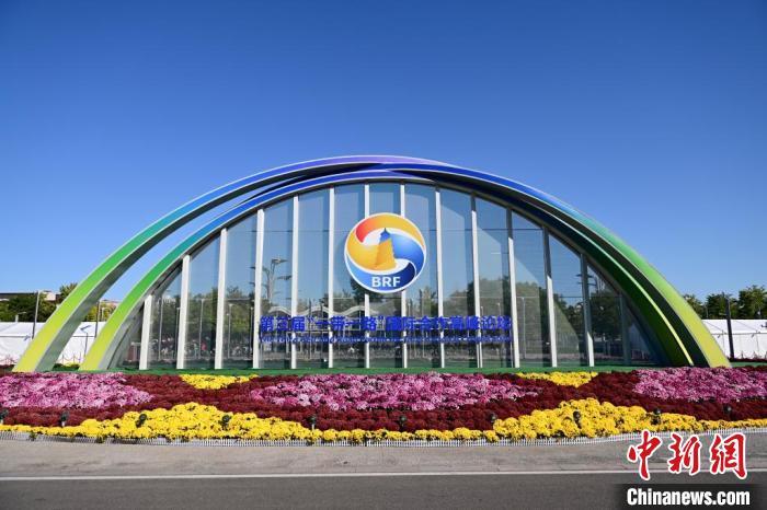 10月15日,北京,國家會(hui) 議中心外的第三屆“一帶一路”國際合作高峰論壇景觀布置。當日,位於(yu) 國家會(hui) 議中心的第三屆“一帶一路”國際合作高峰論壇新聞中心啟動試運行。 中新社記者 田雨昊 攝