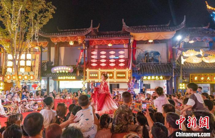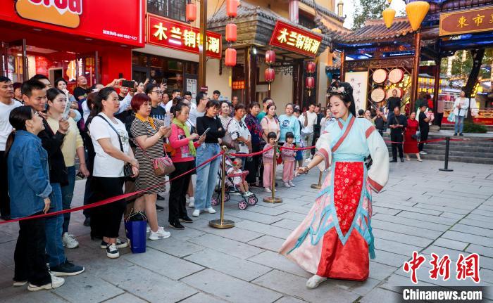 10月18日,遊客在木蘭(lan) 不夜城觀看演出。張暢 攝