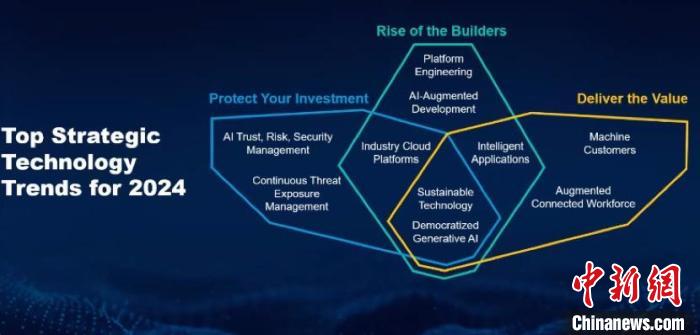 中新網北京10月23日電 (記者 肖欣)國際機構高德納(Gartner)日前發布“2024年十大戰略技術趨勢”,此次發布的年度戰略技術趨勢圍繞“保護你的投資、開發者的崛起、交付價(jia) 值”三大主題,人工智能(AI)成為(wei) 貫穿單項趨勢的共同主題。