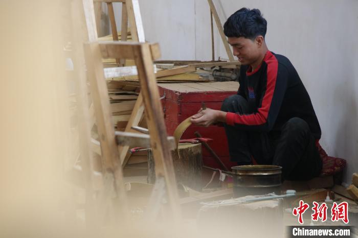 10月15日,新疆阿克蘇地區新和縣依其艾日克鎮加依村樂(le) 器製作匠人努爾冬·司馬義(yi) 在檢查手工製作的樂(le) 器。苟繼鵬 攝