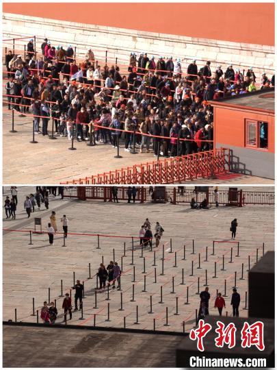 上圖為(wei) 10月20日9時許,故宮博物院午門外檢票現場;下圖為(wei) 10月19日13時許,故宮博物院午門外檢票現場。 故宮博物院供圖
