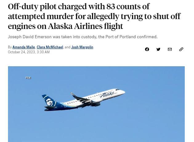 中新網10月24日電 綜合美媒24日報道,美國官員透露,近日,美國阿拉斯加航空一趟航班遭遇了一起驚險事件,一名未當班的飛行員試圖在飛行途中關(guan) 閉發動機。目前,這名飛行員已被控83項謀殺未遂罪名。