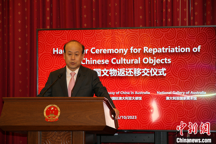 當地時間10月25日上午,經中國國家文物局授權,中國駐澳大利亞(ya) 大使館在堪培拉舉(ju) 行儀(yi) 式,接收澳方向中國返還共4件流失文物藝術品與(yu) 1件古生物化石。中國駐澳大利亞(ya) 大使肖千在致辭中表示,這些文物回歸祖國,顯示了中澳兩(liang) 國政府對於(yu) 保護文化遺產(chan) 的共同承諾,是雙方文化遺產(chan) 交流的一次盛事和友好合作的見證。 中新社記者 顧時宏 攝
