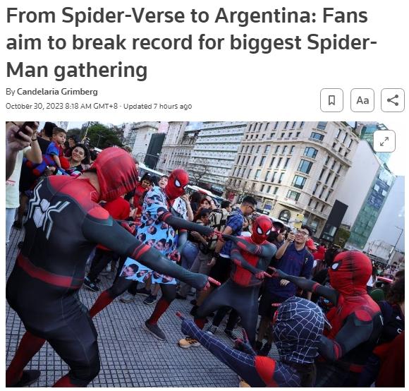 據報道,阿根廷網紅尤基·丁恩(Uki Deane)通過社交媒體(ti) 籌辦了這次活動,希望能一舉(ju) 打破馬來西亞(ya) 2023年6月創下的685名“蜘蛛俠(xia) ”齊聚的紀錄。