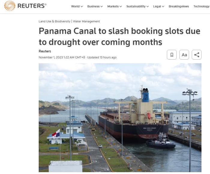 據報道,巴拿馬運河管理局(ACP)在10月30日晚間的公告中表示,從(cong) 11月3日開始,巴拿馬運河的通行名額將從(cong) 每天31個(ge) 減少到每天25個(ge) ,並將在未來三個(ge) 月內(nei) 逐步減少,計劃到2024年2月減少為(wei) 每天18個(ge) 名額。