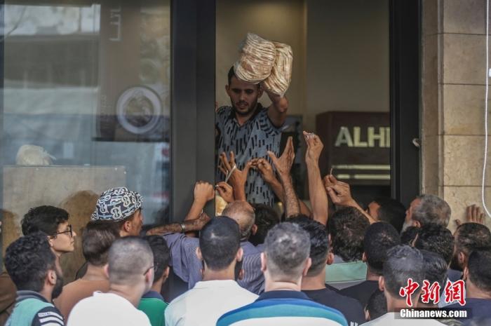 當地時間10月17日,加沙地帶南部城市汗尤尼斯,巴勒斯坦公民聚集在一家麵包店前搶購麵包。