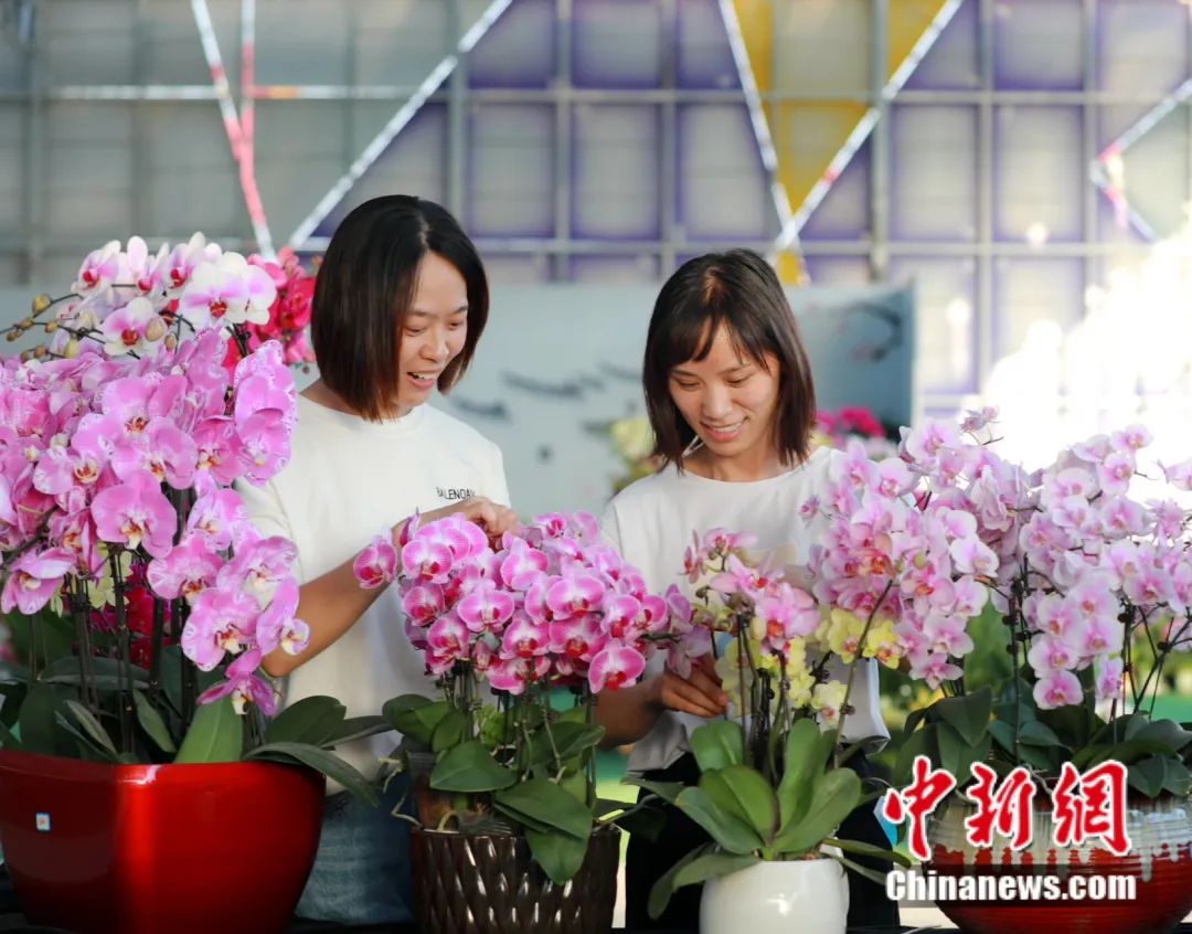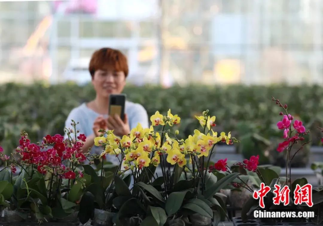 負責人喬(qiao) 闖行走其間,查看蘭(lan) 花長勢,準備著一天的工作。“再過一會(hui) ,基地的主播們(men) 就會(hui) 開始一天的直播,將蘭(lan) 花推介給全國各地的消費者。”