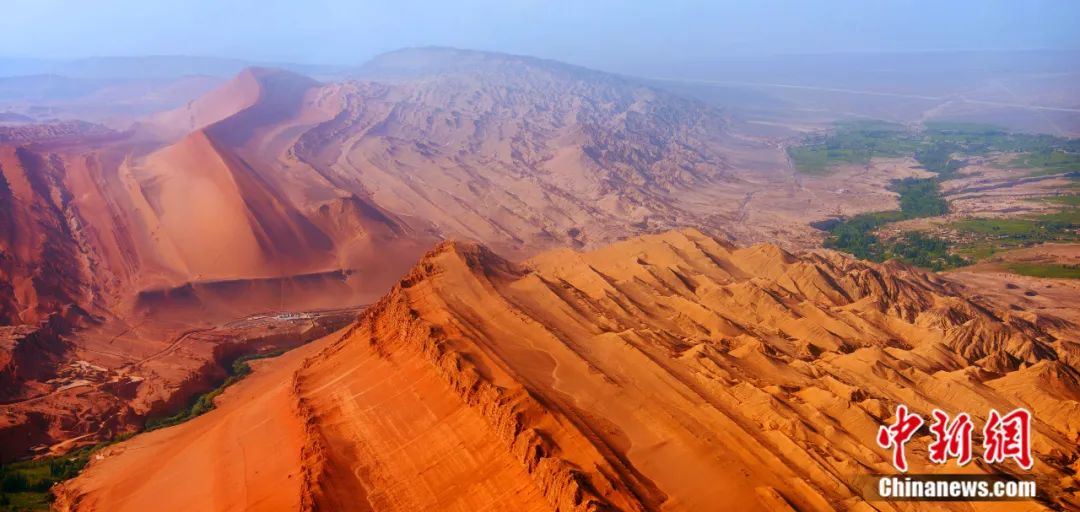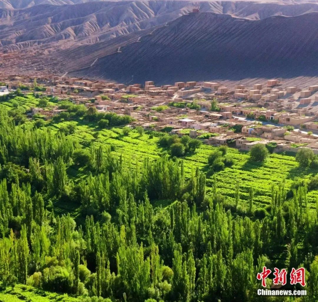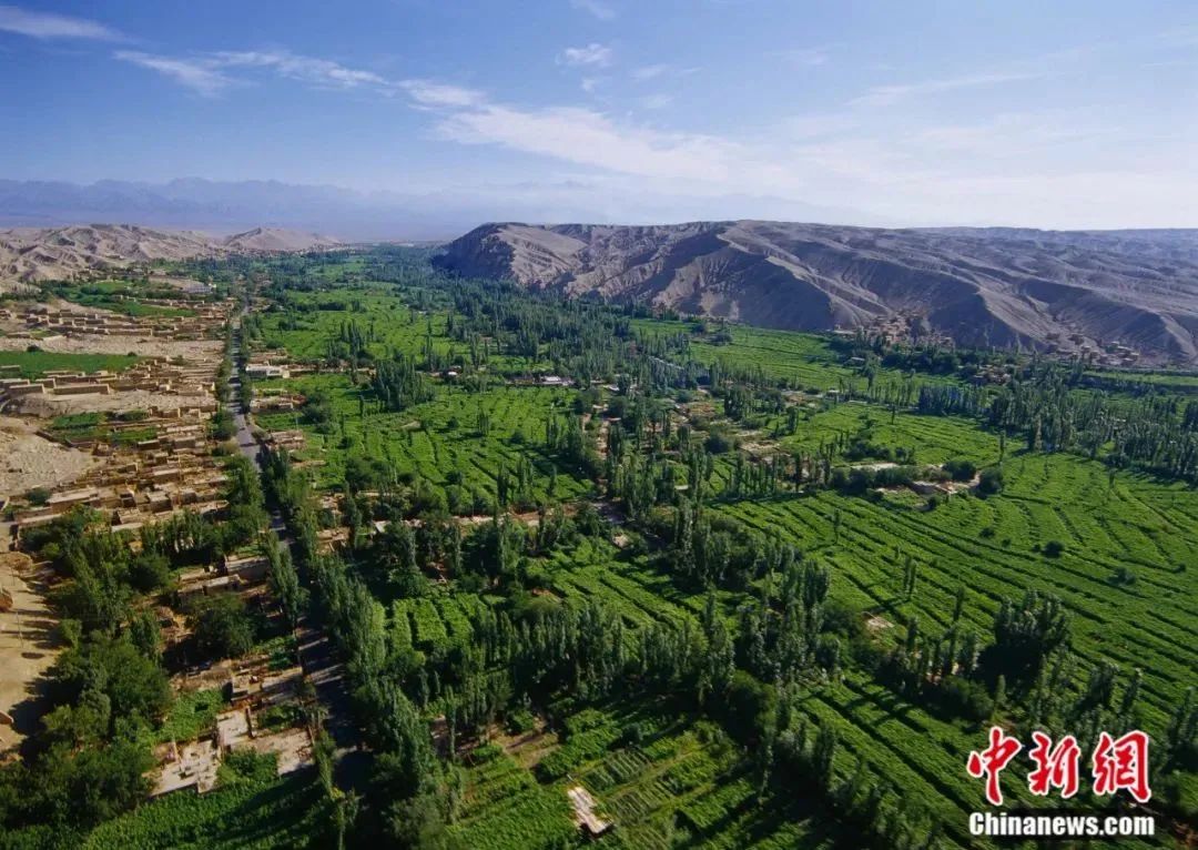 火焰山西側(ce) 的峽穀中有一片綠洲
