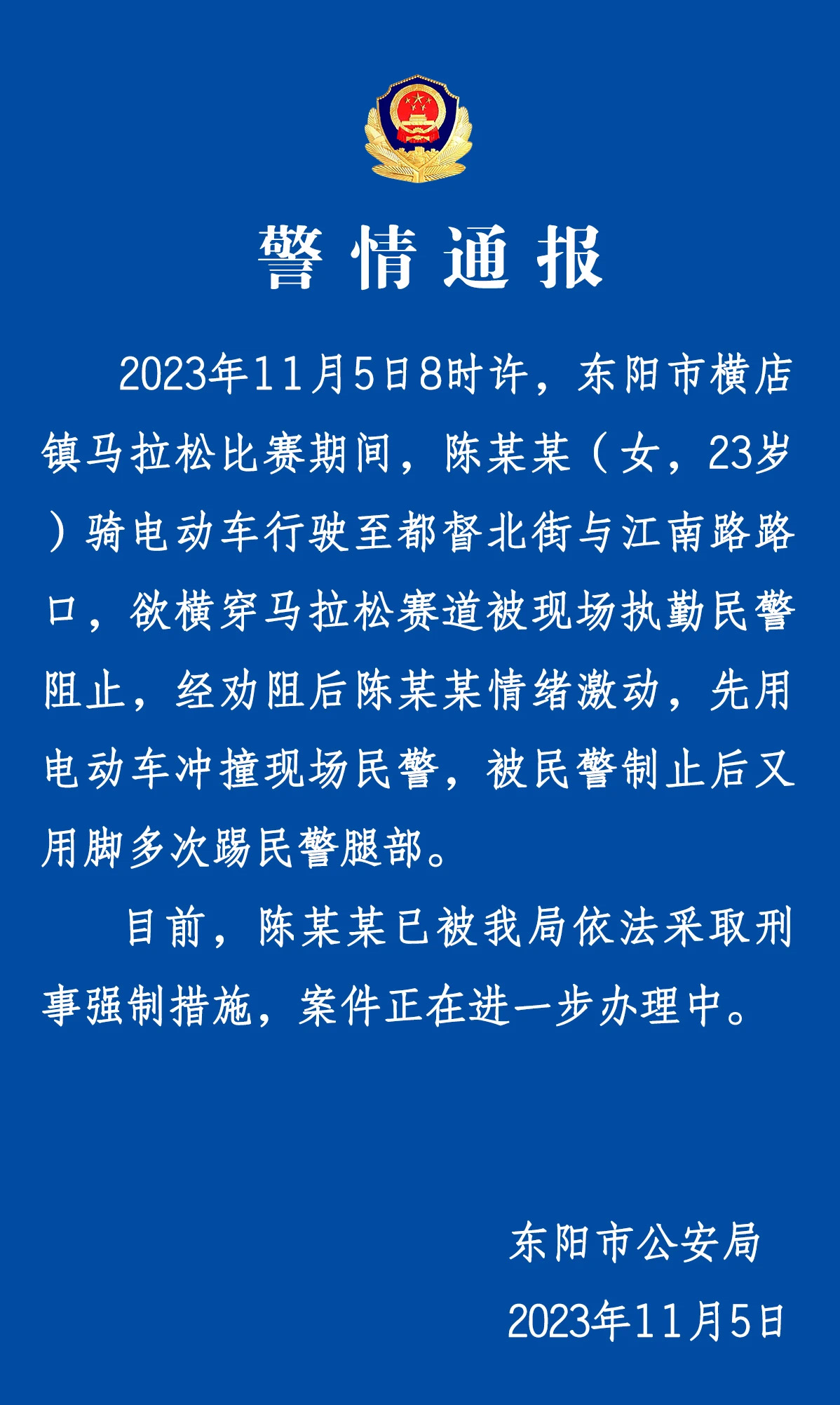 中新網金華11月6日電(董易鑫)浙江金華東(dong) 陽市公安局11月5日發布警情通報稱,2023年11月5日8時許,東(dong) 陽市橫店鎮馬拉鬆比賽期間,陳某某(女,23歲)騎電動車行駛至都督北街與(yu) 江南路路口,欲橫穿馬拉鬆賽道被現場執勤民警阻止,經勸阻後陳某某情緒激動,先用電動車衝(chong) 撞現場民警,被民警製止後又用腳多次踢民警腿部。