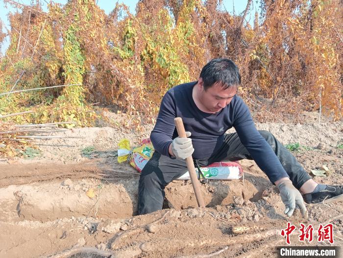 11月3日上午,山西新絳縣龍興(xing) 鎮橋東(dong) 村村民郭龍正在挖山藥。站著挖、跪著挖、坐著挖……雖然氣溫不高,他的額頭還是掛滿汗珠。