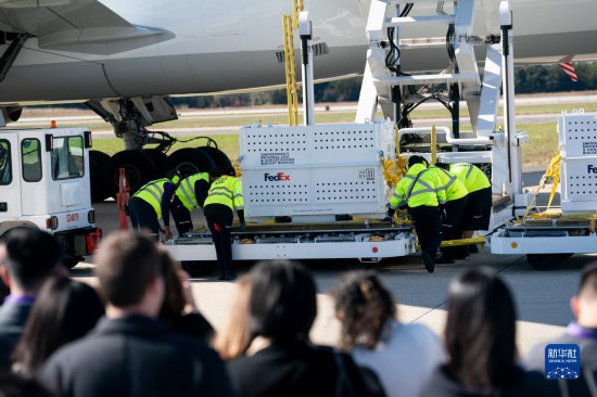 11月8日,在美國弗吉尼亞(ya) 州的華盛頓杜勒斯國際機場,裝有大熊貓的特製“旅行包廂”準備運上專(zhuan) 機。新華社記者劉傑攝