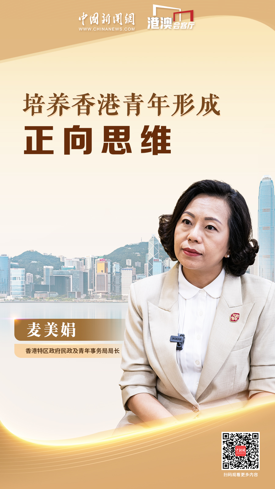 香港特區政府民政及青年事務局局長麥美娟近日接受中國新聞網“港澳會(hui) 客廳”欄目專(zhuan) 訪時表示,要培養(yang) 香港青年形成正向思維。