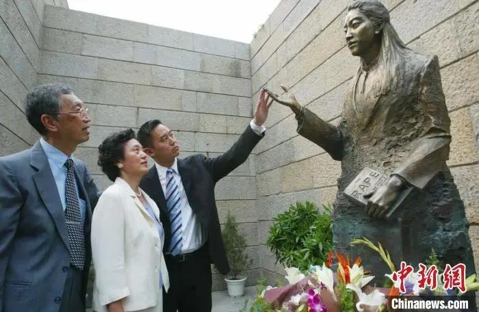 2005年,侵華日軍(jun) 南京大屠殺遇難同胞紀念館內(nei) ,張紹進、張盈盈(左)為(wei) 女兒(er) 張純如雕塑揭幕。(資料圖) 中新社記者 泱波 攝