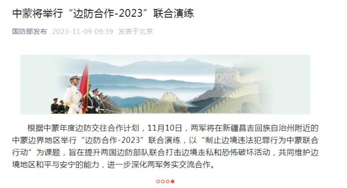 中新網11月9日電 據國防部發布微信公眾(zhong) 號消息,根據中蒙年度邊防交往合作計劃,11月10日,兩(liang) 軍(jun) 將在新疆昌吉回族自治州附近的中蒙邊界地區舉(ju) 行“邊防合作-2023”聯合演練,以“製止邊境違法犯罪行為(wei) 中蒙聯合行動”為(wei) 課題,旨在提升兩(liang) 國邊防部隊聯合打擊邊境走私和恐怖破壞活動,共同維護邊境地區和平與(yu) 安寧的能力,進一步深化兩(liang) 軍(jun) 務實交流合作。