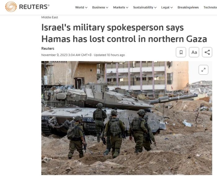 中新網11月9日電 據路透社報道,當地時間8日,以色列軍(jun) 方發言人丹尼爾·哈加裏(Daniel Hagari)表示,隨著數千居民向南遷移,巴勒斯坦伊斯蘭(lan) 抵抗運動(哈馬斯)已經失去了對加沙地帶北部的控製。