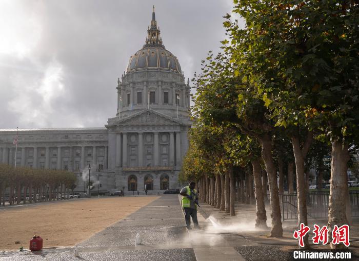 當地時間11月6日,工作人員在舊金山市政廳前的市政中心廣場清潔地麵。 中新社記者 劉關(guan) 關(guan) 攝