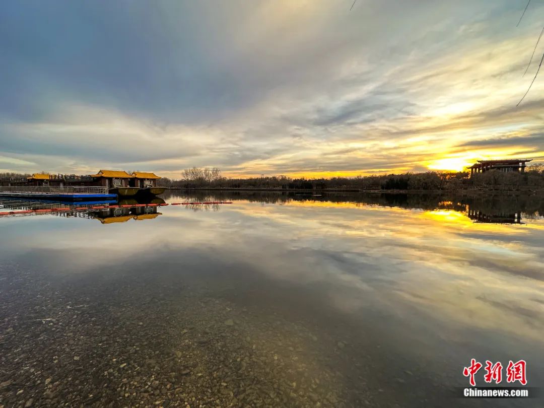 2022年12月11日,夕陽映照大運河,北京通州大運河森林公園裏落日餘(yu) 暉映晚霞,一抹夕陽美如畫。王丹楓 攝