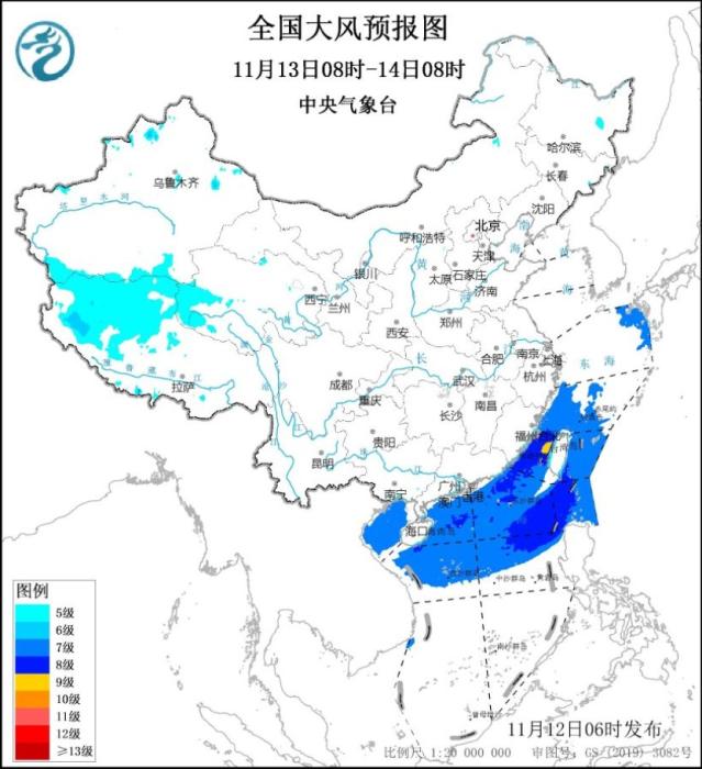12日08時至13日08時,新疆沿天山地區和南疆盆地、青海東(dong) 部和西部、福建東(dong) 南部沿海地區、台灣島等地部分地區將有5~6級、陣風7~8級的大風;東(dong) 海大部海域、台灣海峽、台灣以東(dong) 洋麵、巴士海峽、南海北部和中部海域、北部灣將有7~8級、陣風9級的大風,其中台灣海峽部分海域風力可達9級、陣風10級。13日08時至14日08時,新疆南疆盆地、西藏北部和西部、青海西部、福建東(dong) 南部沿海地區、台灣島等地將有5~6級、陣風7~8級的大風;東(dong) 海南部海域、台灣海峽、台灣以東(dong) 洋麵、巴士海峽、南海北部和中部海域、北部灣、瓊州海峽將有7~8級、陣風9級的大風,其中台灣海峽部分海域風力可達9級、陣風10級。中央氣象台11月12日06時繼續發布大風藍色預警。