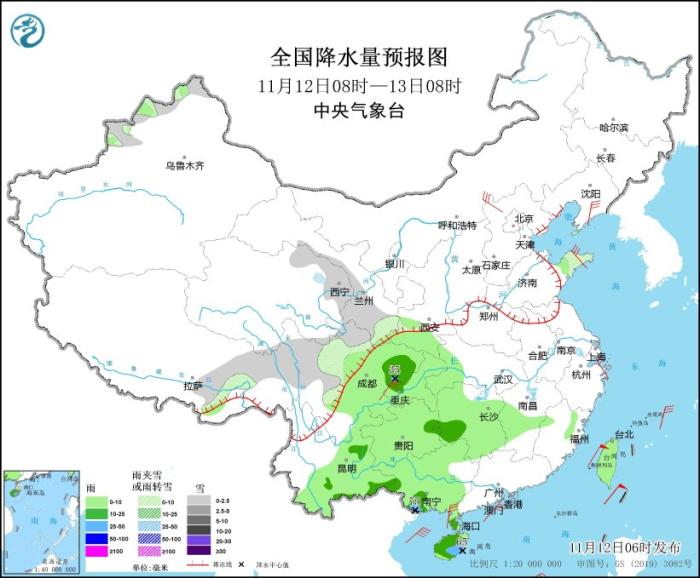 11月12日08時至13日08時,新疆北疆北部和伊犁河穀、西藏東(dong) 部、青海南部和東(dong) 部、川西高原北部、甘肅中南部等地部分地區有小雪或雨夾雪。四川盆地、貴州東(dong) 部、湖南西部、雲(yun) 南南部和東(dong) 部、廣西南部、雷州半島、海南島等地部分地區有中到大雨,其中,廣西南部、海南島東(dong) 部局地有暴雨(50~75毫米)。內(nei) 蒙古中東(dong) 部、遼東(dong) 半島、河北北部、山東(dong) 半島、四川盆地、浙江東(dong) 部、雷州半島等地部分地區有5~6級風。東(dong) 海大部、台灣海峽、台灣以東(dong) 洋麵、巴士海峽、南海北部和中部、北部灣將有7~8級、陣風9級的大風。