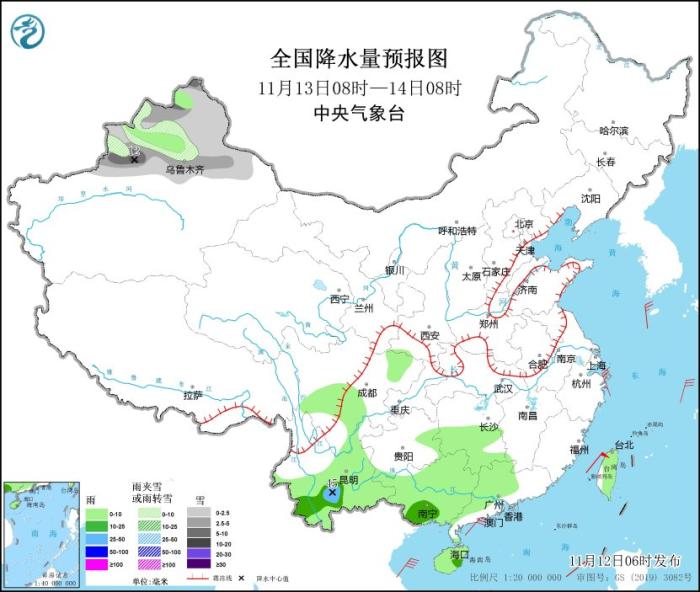 11月13日08時至14日08時,新疆北部等地部分地區有小到中雪或雨夾雪,局地大到暴雪(10~12毫米)。湖南南部、四川盆地、貴州南部和東(dong) 部、雲(yun) 南大部、廣西、廣東(dong) 北部、海南島、台灣島等地部分地區有小到中雨,其中,雲(yun) 南中部局地有大雨(25~45毫米)。東(dong) 海南部、台灣海峽、台灣以東(dong) 洋麵、巴士海峽、南海北部和中部、北部灣、瓊州海峽將有7~8級、陣風9級的大風。
