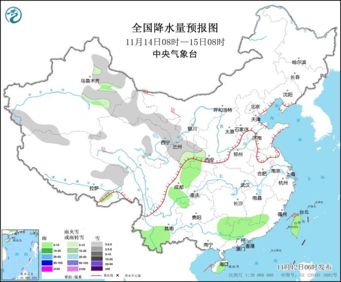 11月14日08時至15日08時,新疆沿天山地區和南疆西南部、西藏北部和東(dong) 部、青海北部和東(dong) 部、甘肅大部、寧夏南部等地部分地區有小雪或雨夾雪。甘肅南部、陝西南部、湖南南部、江西南部、福建西南部、四川盆地、雲(yun) 南中部和西南部、廣西東(dong) 部、廣東(dong) 中北部、海南島東(dong) 部、台灣島等地部分地區有小雨。內(nei) 蒙古西北部、青海西部等地部分地區有5~7級風。台灣海峽、北部灣、瓊州海峽將有7~8級、陣風9級的大風。