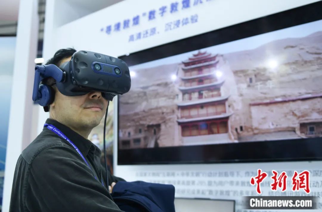 2023年世界互聯網大會(hui) “互聯網之光”博覽會(hui) 上,一位參觀者使用VR眼鏡體(ti) 驗數字敦煌。王剛 攝