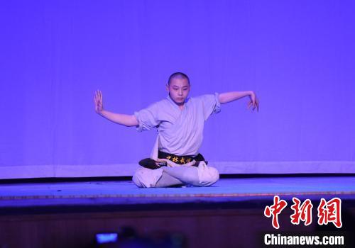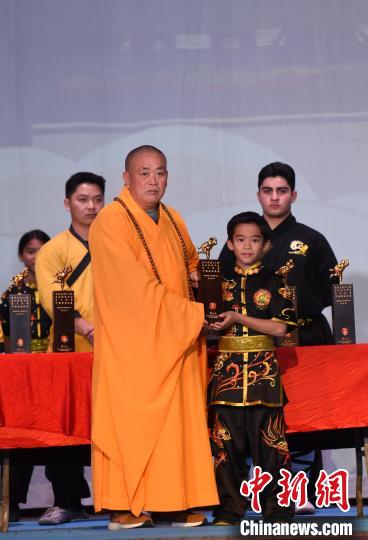 當地時間11月12日下午,由中國嵩山少林寺主辦的“不朽少林”少林功夫公演在已有逾百年曆史的美國洛杉磯Million Dollar劇院舉(ju) 行。圖為(wei) 嵩山少林寺方丈釋永信向“北美洲少林考功大賽”獲獎者頒獎。 中新社記者 張朔 攝