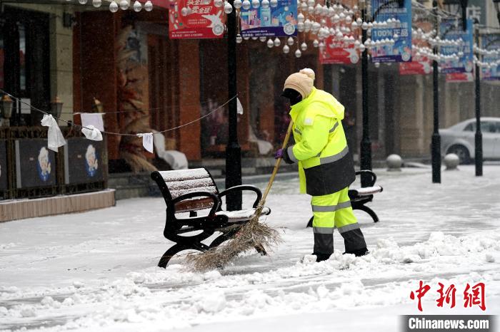 11月16日,環衛工人在清理哈爾濱市街路上的積雪。趙宇航 攝