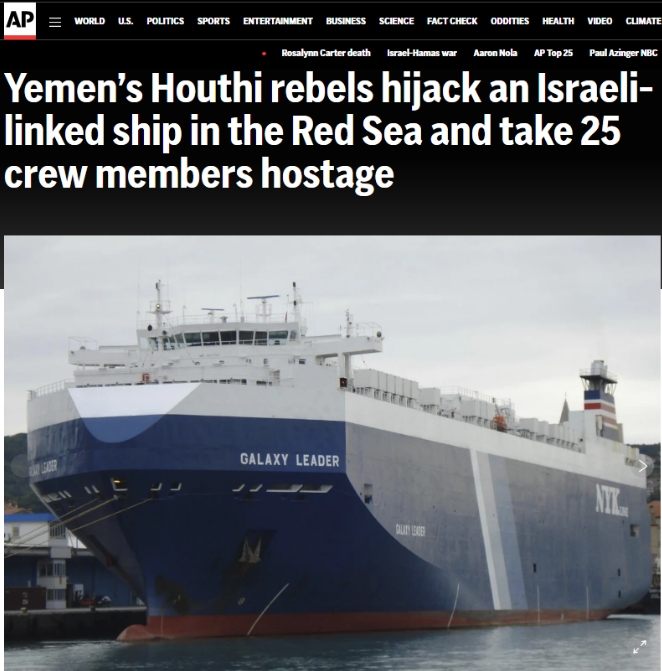 中新網11月20日電 綜合外媒消息,當地時間19日,也門胡塞武裝稱,他們(men) 在紅海海域扣押了一艘正在航行中的以色列貨船,並已將其帶到也門海岸。