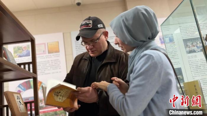 11月中旬,甘肅中醫藥大學俄羅斯留學生李峰夫婦,在圖書(shu) 室翻看中醫相關(guan) 書(shu) 籍。 王牧雨 攝