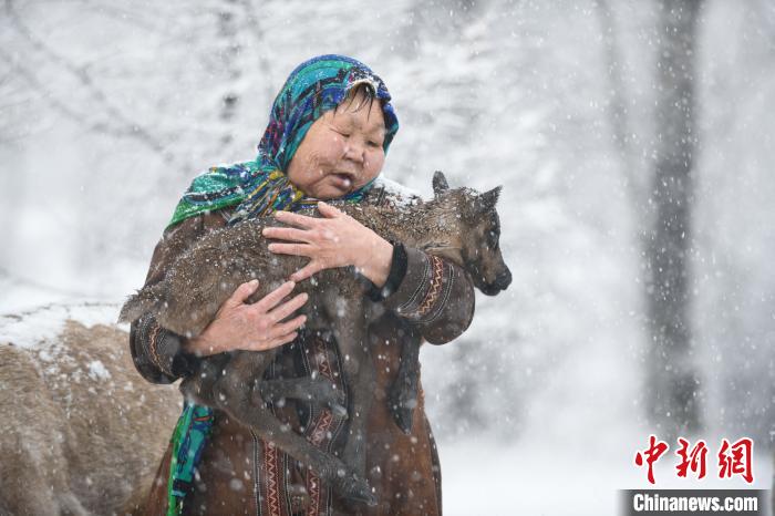 資料圖。圖為(wei) 2023年4月29日,在內(nei) 蒙古大興(xing) 安嶺,柳霞在雪中懷抱一頭剛出生不久的馴鹿幼崽。 王偉(wei) 攝
